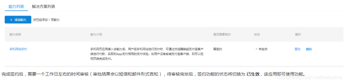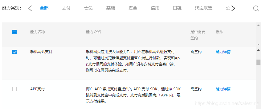 应用创建完成后,系统会自动跳转到应用详情页面。在 能力列表 中点击 添加能力 来添加 手机网站支付 功能。参考文档: