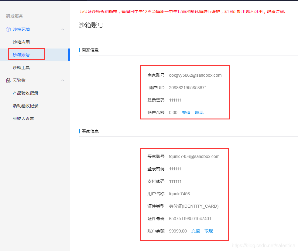 沙箱钱包的买家和卖家账号密码 支付宝都有提供,可点击沙箱账号进行查看,如下图: