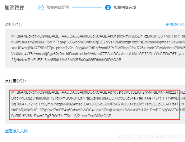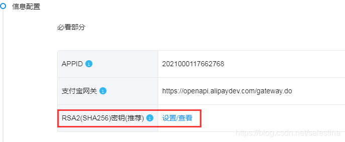 将appid,支付宝网关都替换为沙箱应用页面中提供的信息,异步通知地址在沙盒账号中用不到,所以可先注释掉。应用私钥和应用公钥需要使用支付宝提供的加密工具生成,然后要将应用公钥配置到沙盒应用里的RSA2(SHA256)密钥处,从而得到支付宝公钥: