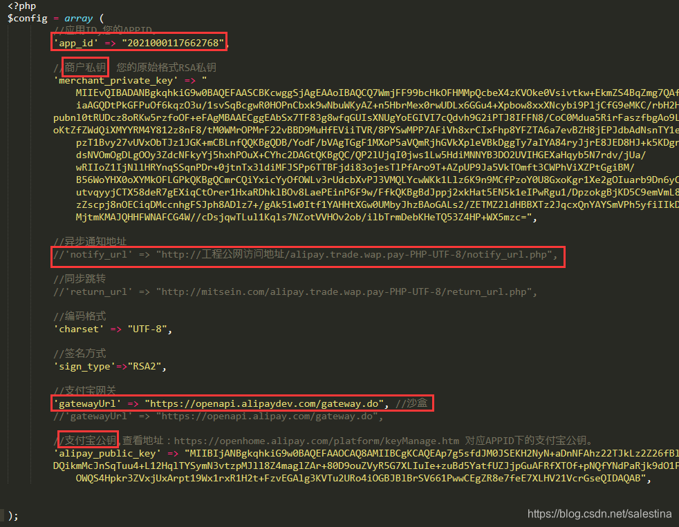 然后将支付宝公钥配置到代码中的config.php(以PHP DEMO为例)文件中,将加密工具中生成的应用私钥直接填写到config.php的商户私钥处即可。