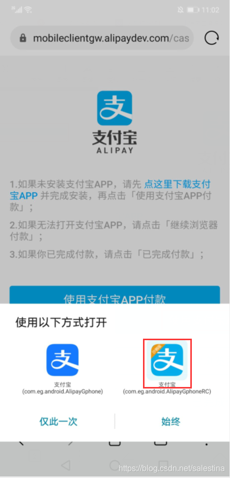 点击 使用支付宝APP付款 按钮后,重新开始如上所述的“用户已安装支付宝支付流程”步骤。