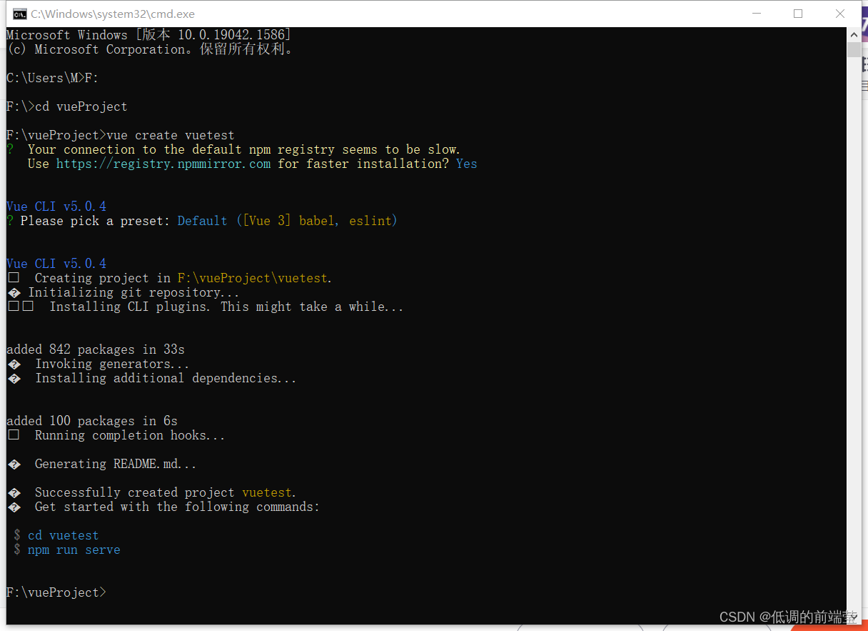 建议将开发的项目可以放到同一个文件夹下建立分文件夹,方便维护查找。比如我将开发的vue项目统一放到我的F盘下的vueProject文件夹下。使用cmd命令先切换到F://vueProject下再使用创建项目命令。
