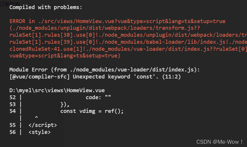 错误位置在D:\myel\src\views\admin\AdminView.vue中的第四行第2个字符;(报错位置不一定每次都是准确的,但是可以根据提示缩小范围)