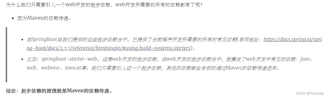 如果我们使用了SpringBoot,就不需要像上面这么繁琐的引入依赖了。我们只需要引入一个依赖就可以了,那就是web开发的起步依赖:springboot-starter-web。