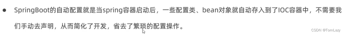 我们知道了什么是自动配置之后,接下来我们就要来剖析自动配置的原理。解析自动配置的原理就是分析在 SpringBoot项目当中,我们引入对应的依赖之后,是如何将依赖jar包当中所提供的bean以及配置类直接加载到当前项目的SpringIOC容器当中的。