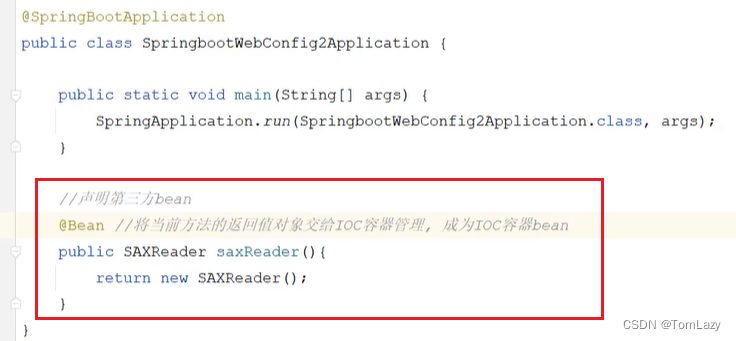 ①、在启动类中声明第三方bean:(以Dom4j:解析XML文件对象为例)