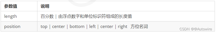 参数代表的意思是:x 坐标和 y 坐标。 可以使用 方位名词 或者 精确单位