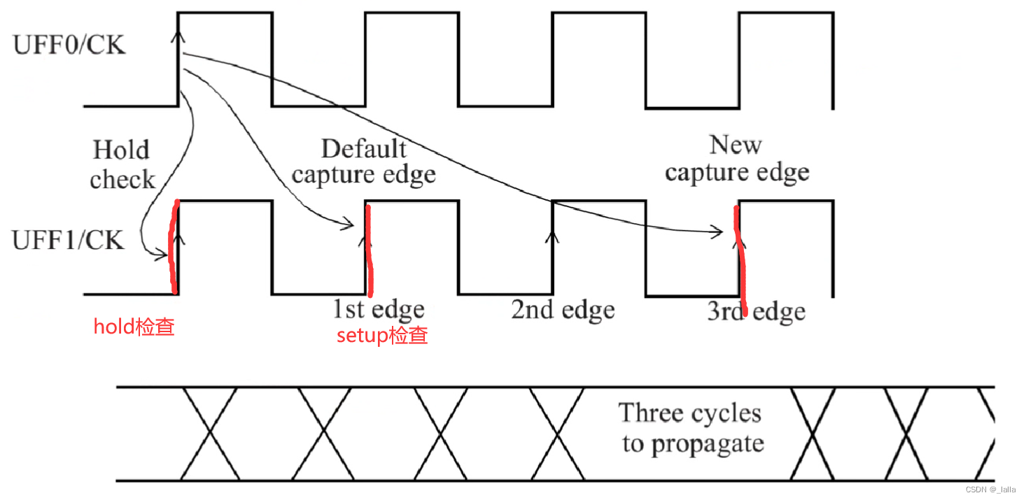本来默认的保持时间检查边沿是建立时间检查的前一个周期,在这里第三个周期检查建立时间,理论上第二个周期检查,但是这样对于保持时间的时序要求太严格了,也不符合我们实际的需求,需要保持这么多个周期,因此把保持时间检查节点向前移了两个周期。
