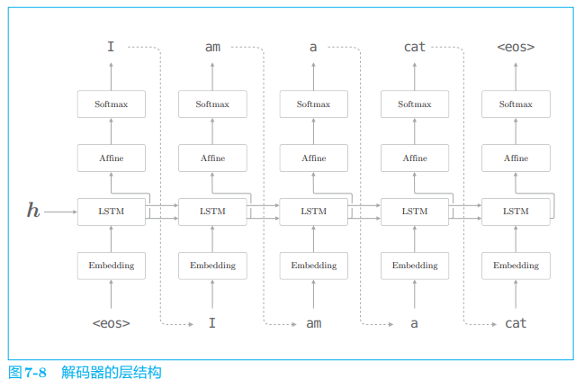 如图 7-26 所示,将编码器的输出 h h h 分配给所有时刻的 Affine 层和 LSTM 层。比较图 7-26 和图 7-25 可知,之前 LSTM 层专用的重要信息 h h h 现在在多个层(在这个例子中有 8 个层)中共享了。重要的信息不是一个人专有,而是多人共享,这样我们或许可以做出更加正确的判断。