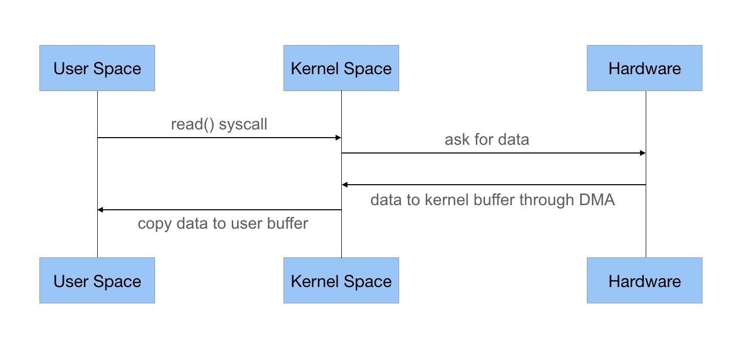 在这个过程中,数据先从外部设备复制到内核空间,再从内核空间复制到用户空间,这就发生了两次内存复制操作。这种操作会导致不必要的数据拷贝和上下文切换,从而降低I/O的性能。