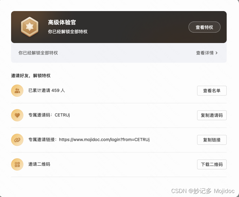 所以,我们推出了「最妙体验官」的活动,期待你能将妙记多 Mojidoc 分享出去,成为我们的高级体验官👩🔧🧑🔧