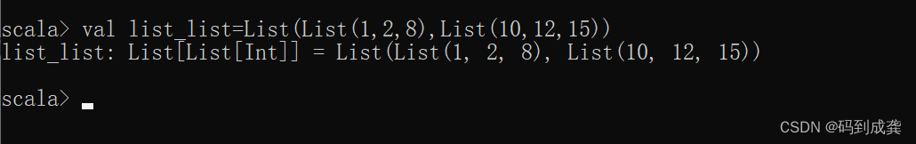 scala> val list_list=List(List(1,2,8),List(10,12,15)) // 列表嵌套列表