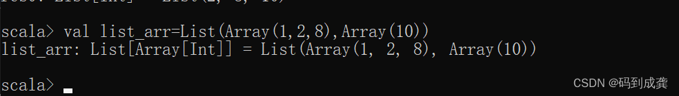 scala> val list_arr=List(Array(1,2,8),Array(10)) // 列表集合序列中嵌套了数组集合序列