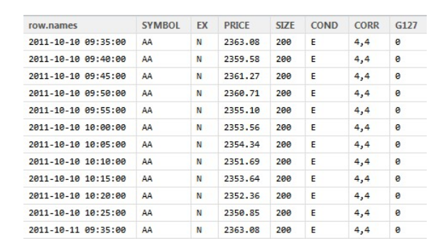 colnames(sample_tdataraw)=c(" ","SYMBOL","EX","PRICE","SIZE","COND","CORR","G127")