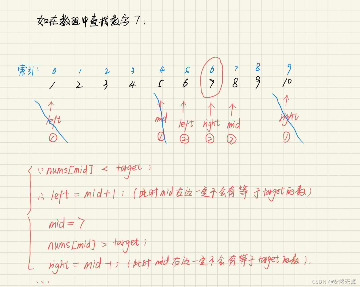 - 每次根据 nums[mid] 和 target 之间的大小进行判断,相等则直接返回下标,nums[mid] < target 则 left 右移,nums[mid] > target 则 right 左移