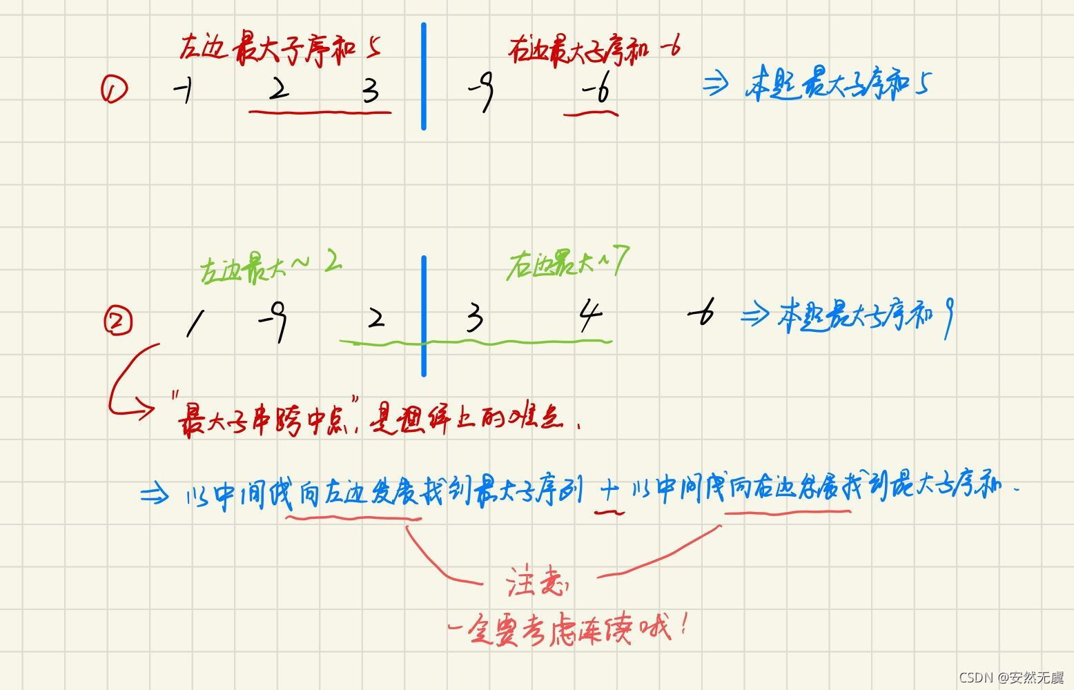 3. 最大子串跨中点,左右两边元素都有(理解上的难点)
