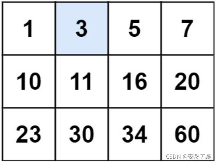 输入:matrix = [[1,3,5,7],[10,11,16,20],[23,30,34,60]], target = 3