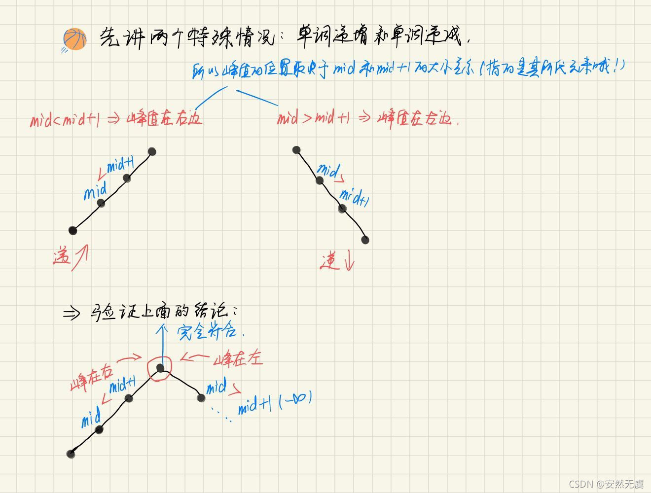 - 规律二:如果nums[mid] < nums[mid+1],则在mid+1之后一定存在峰值元素