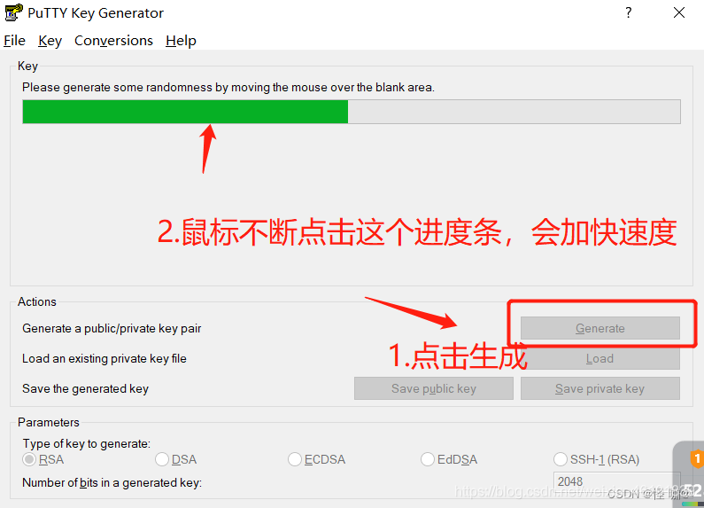 1.开始程序菜单中,打开TortoiseGit,点击 PuTTYgen,在打开的窗口中点击Generate按钮,会出现绿色进度条,生成过程中可以多晃晃鼠标增加随机性。