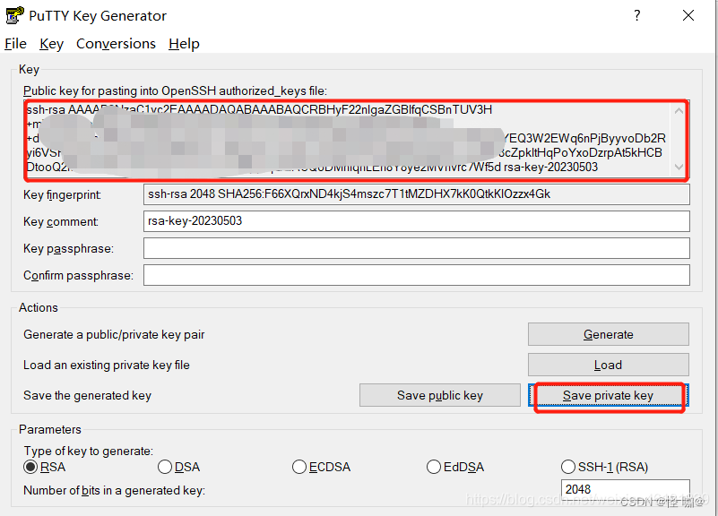 - 生成之后复制生成的全部内容(这个就是公钥),窗口先留着不关闭。点击 Save private key 按钮保存为适用于TortoiseGit的私钥,扩展名为.ppk。