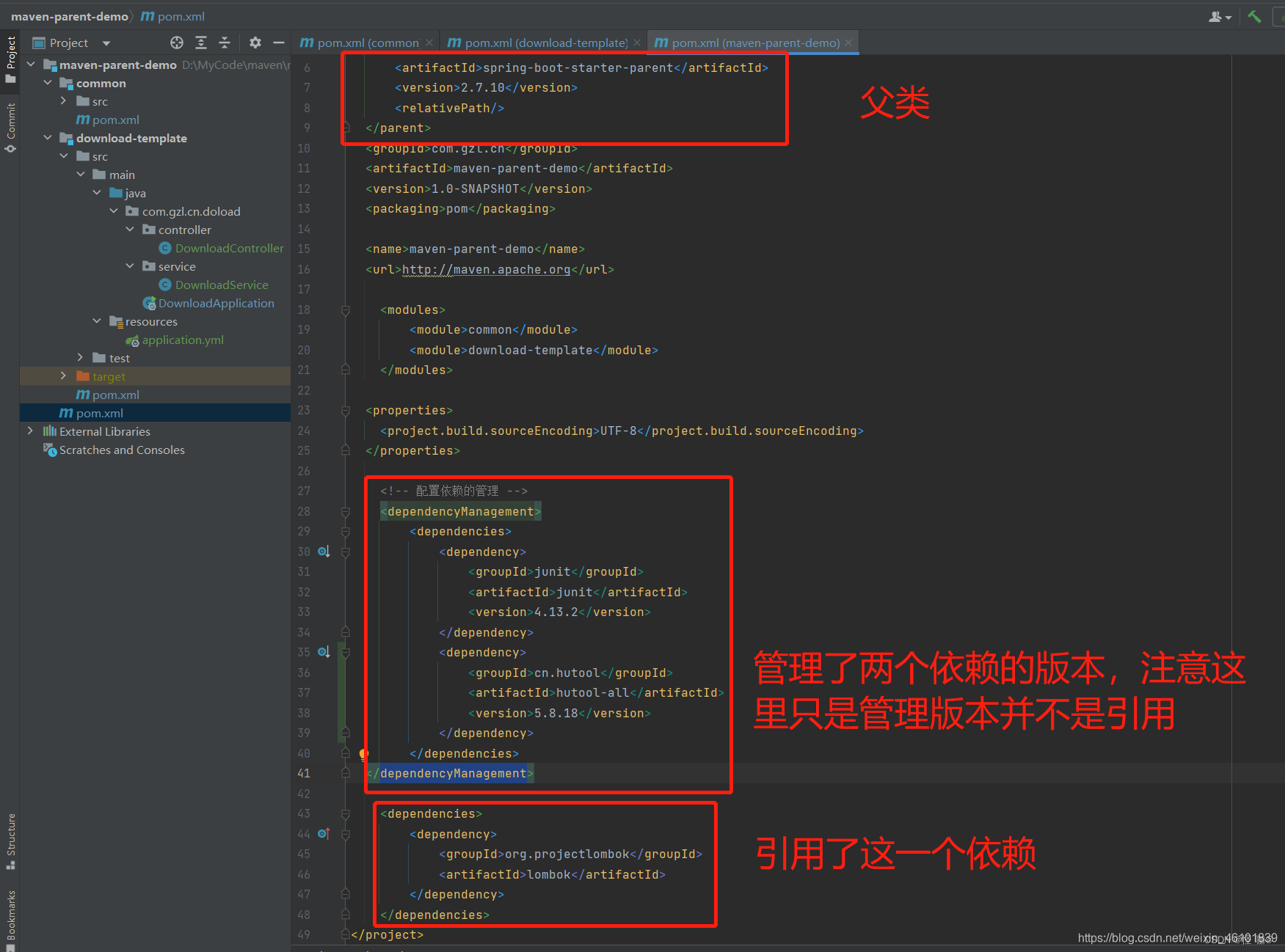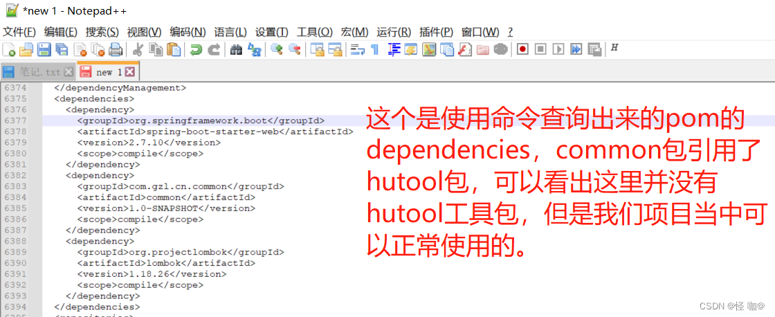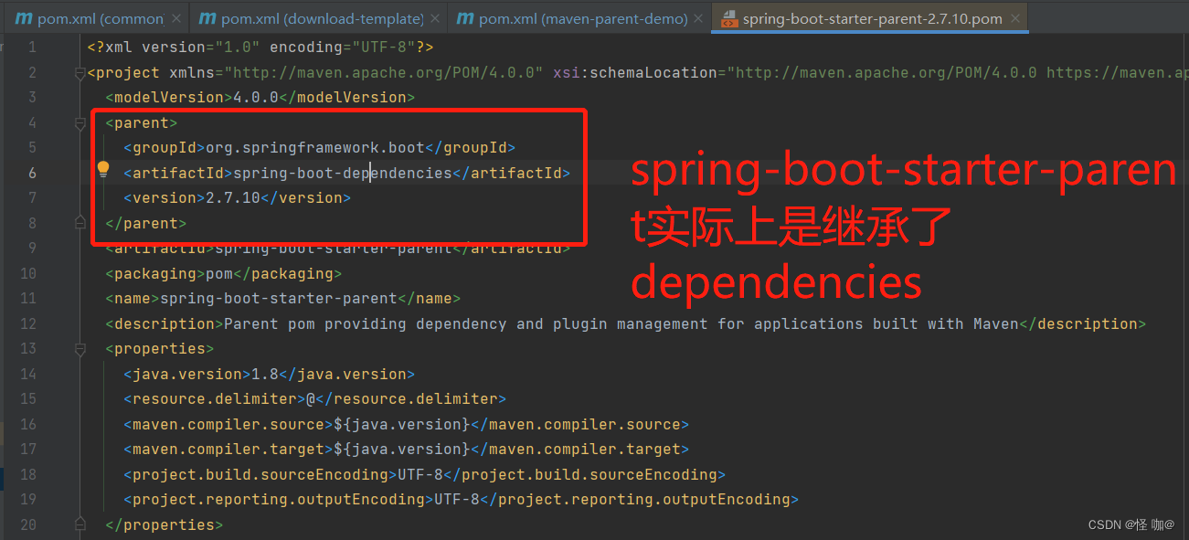 他会把所有父 POM汇集到一起生成一个pom,lombok我是在父类当中引用的,可以发现最终pom当中他会继承过来的。