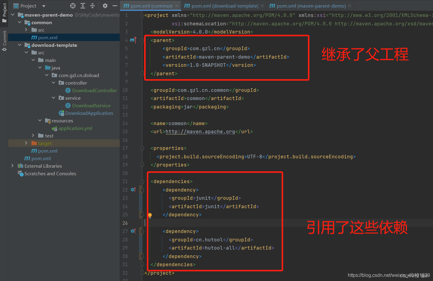 查出来的pom并不会展示出来A引用的其他依赖(不展示并不代表不可以使用,具体是否可以使用要根据依赖的scope来决定的)。只会展示出来当前项目<parent>