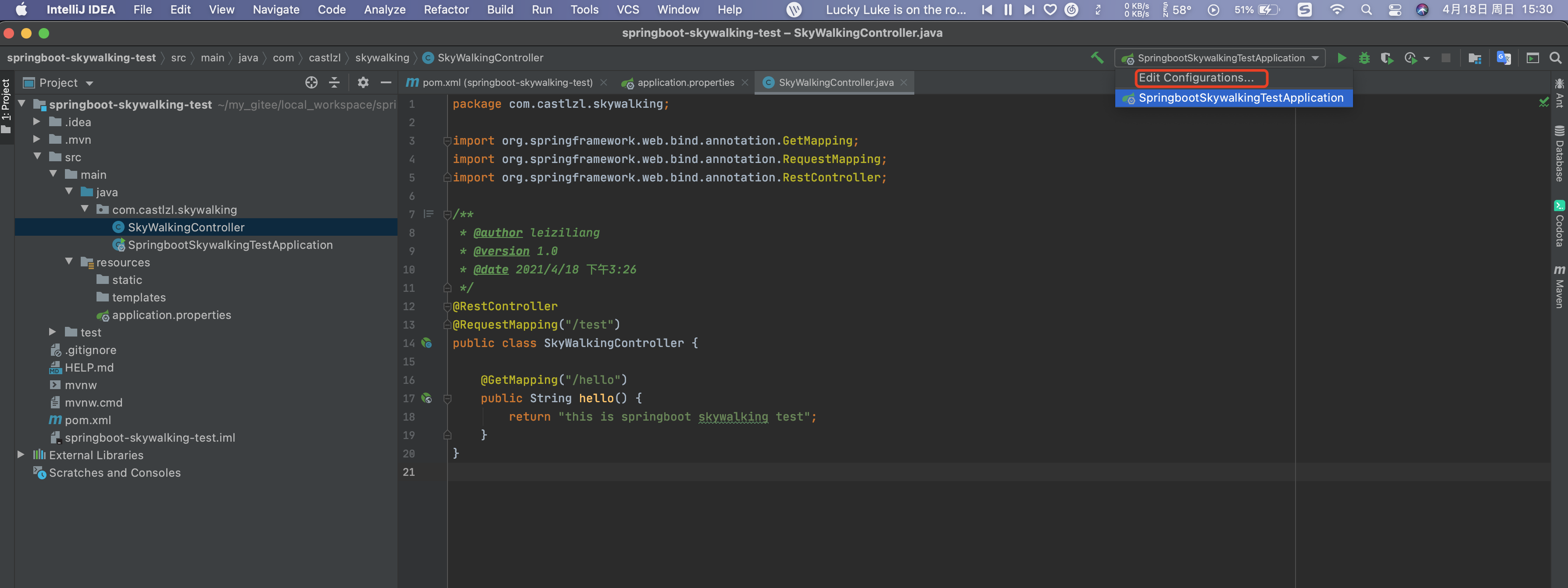 INFO 2021-04-18 15:36:53:169 main SnifferConfigInitializer : Config file found in /Users/leiziliang/my_gitee/skywalking-apm/agent/config/agent.config.