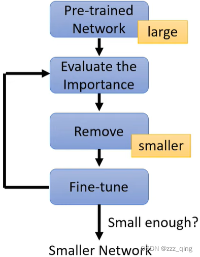 Network Pruning: 把参数/神经元当做修剪的单位,评估参数/神经元的重要性。步骤如下: