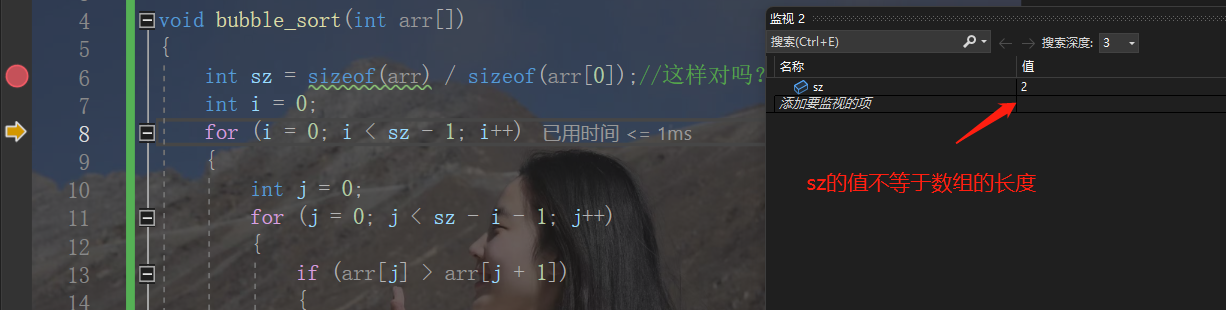 我们之前说的求数组长度的式子,这里求出来和数组元素个数不符合.我们说数组名是首元素地址,所以这个地方我们将arr[ ]数组传过去时,实际上这个arr是一个指针,用来接受数组首元素地址的指针,所以当我们使用sizeof求arr的时候相当于是求了指针变量的大小,我们机器是64位,所以指针大小为8个字节,然而一个整型是4个字节,将它们相除就得到了2.