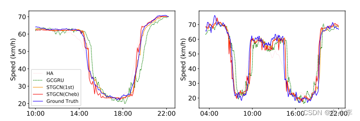 文章的STGCN方案比其他方法更准确地捕捉了交通高峰期的趋势;而且它能比其他车辆更早地检测到交通高峰期的结束。由于有效的图卷积和堆叠时间卷积结构,我们的模型能够快速响应交通网络的动态变化,而不像大多数循环网络那样过度依赖历史平均。