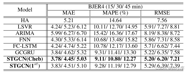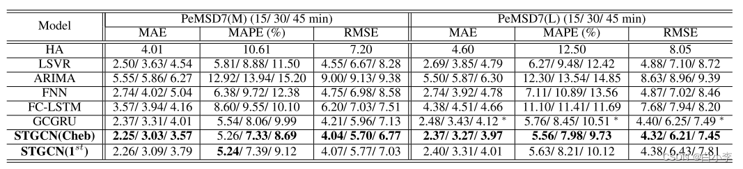 STGCN采用默认设置。文章模型STGCN只消耗272秒,而rnn型的模型GCGRU在PeMSD7(M)上消耗3824秒。这种训练速度的14倍加速主要得益于应用时间卷积而不是循环结构。由于一阶逼近不局限于多项式的参数化,模型的优点也逐渐显现出来。与STGCN(Cheb)相比,模型STGCN(1)在更大的数据集上加速约20%,性能十分优秀。