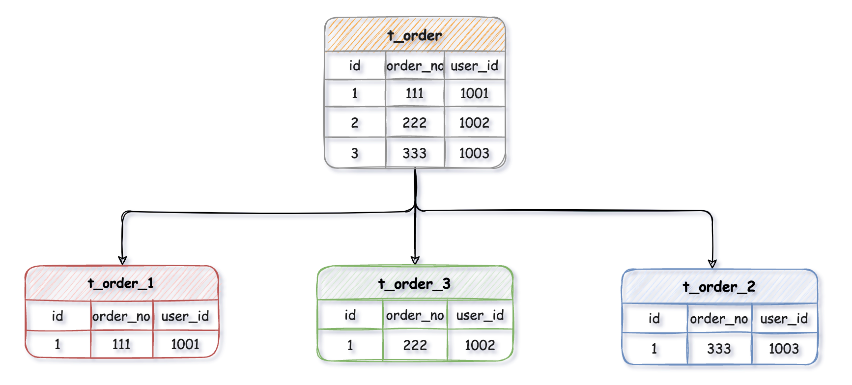 在这个过程中,order_no 就是 t_order 表的分片键。也就是说,每一条订单数据的 order_no 值决定了它应该存放的数据库实例和表。选择一个适合作为分片键的字段可以更好地利用水平分片带来的性能提升。