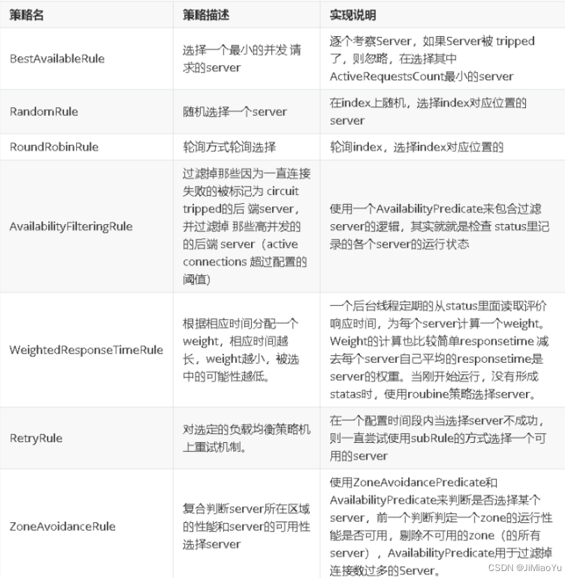 Ribbon内置了多种负载均衡策略,内部负载均衡的顶级接口为 com.netflix.loadbalancer.IRule , 具体的负载策略如下图所示: