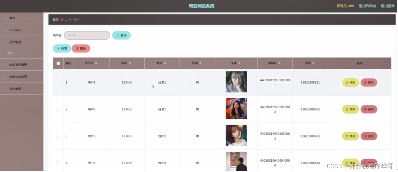 用户管理:通过列表可以获取索引、用户名、密码、姓名、性别、头像、身份证、手机等信息,进行修改或删除操作,如图5-10所示。