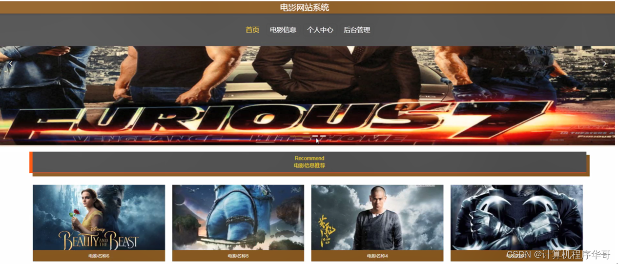 通过网站页面可以查看首页、电影信息、个人中心、后台管理等信息,如图5-1所示。通过用户注册可以填写用户名、密码、姓名、身份证、手机等信息,进行注册操作,如图5-2所示。