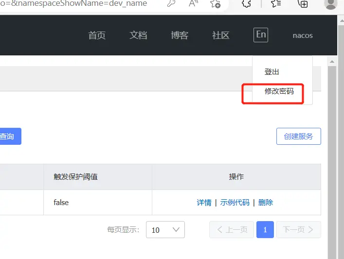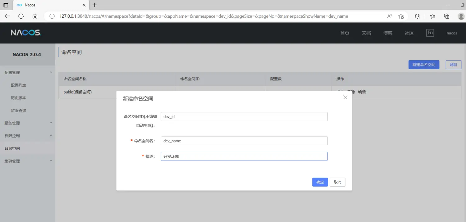 动Nacos 后,打开Nacos 管理界面,在命名空间模块,创建一个开发环境配置的命名空间dev_name ,如下图所示:
