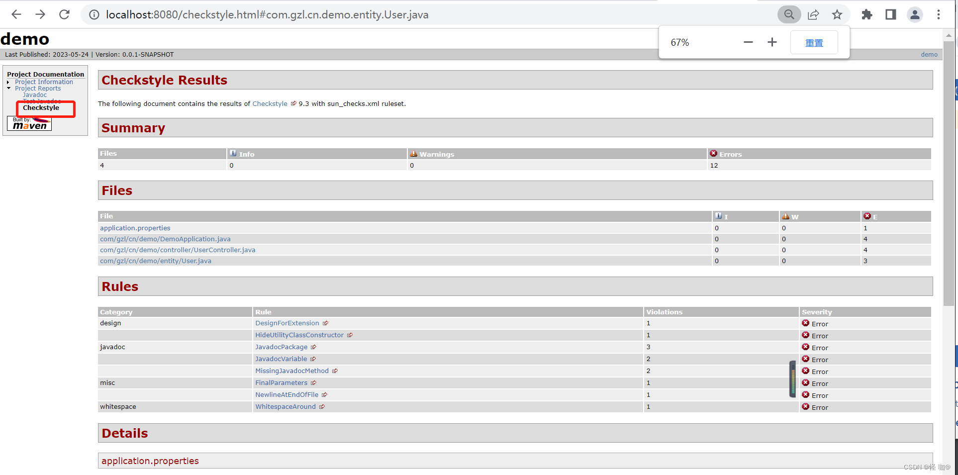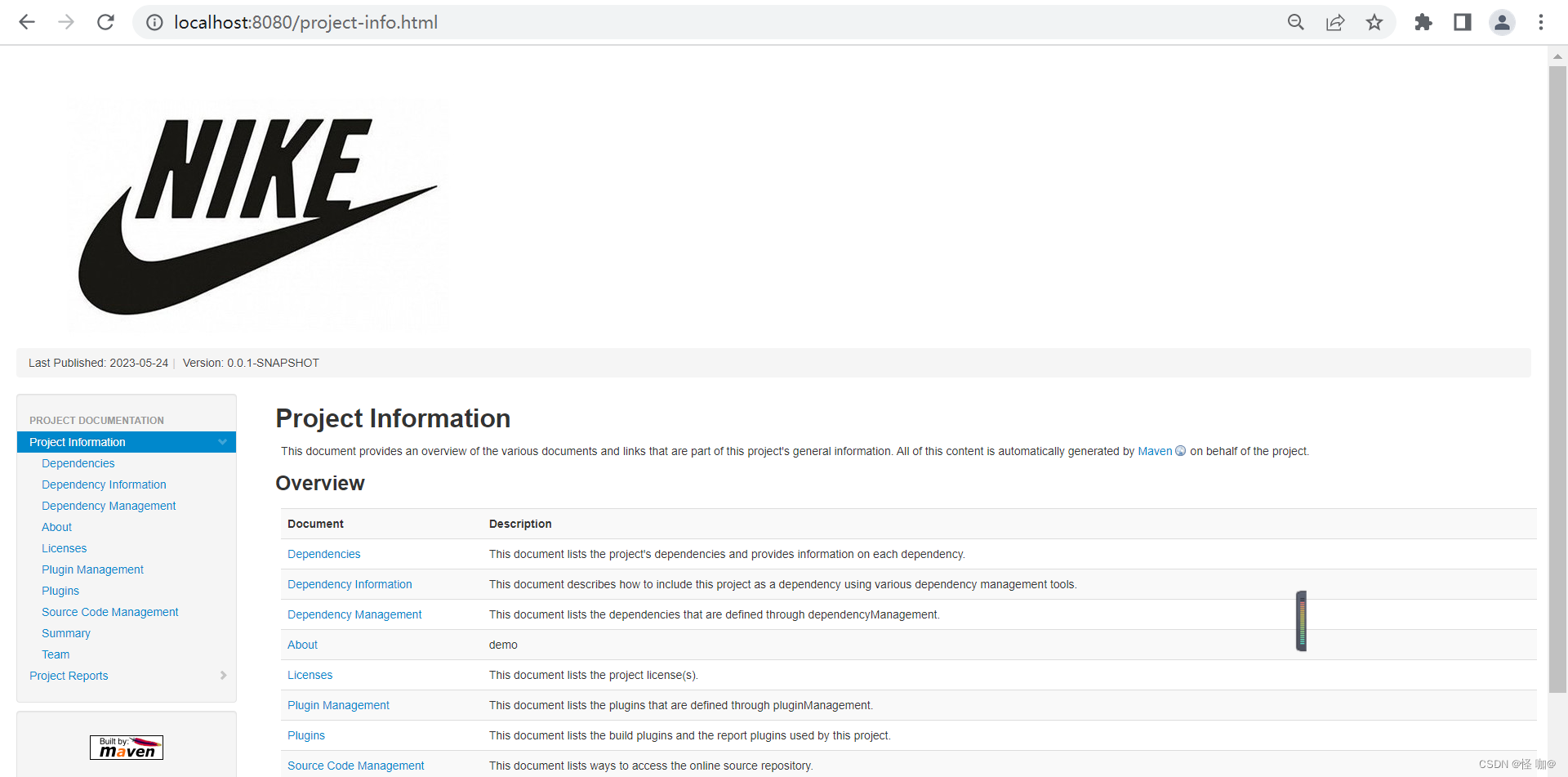 站点生成成功后,我们也可以执行mvn site:run命令运行这个站点。运行的时候会使用 Maven 内置的 jetty 容器来启动。站点启动后,我们可以在浏览器中输入localhost:8080/来浏览该站点。