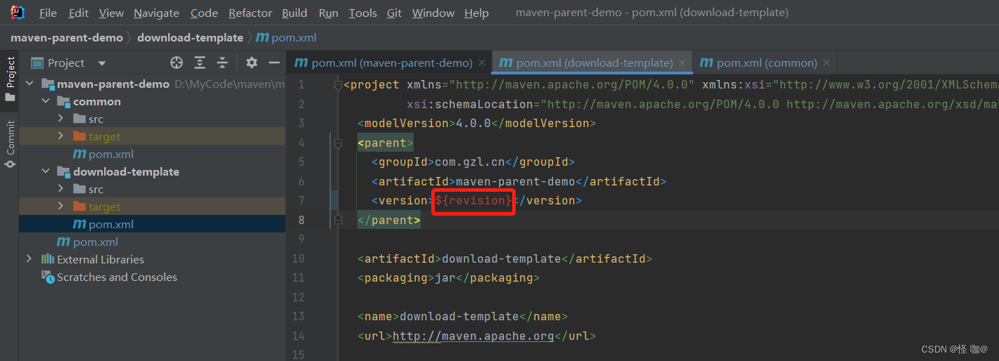 由于properties标签是可以被继承的,所以在子工程当中也可以使用该标签${revision},这样就做到了一处修改处处修改。