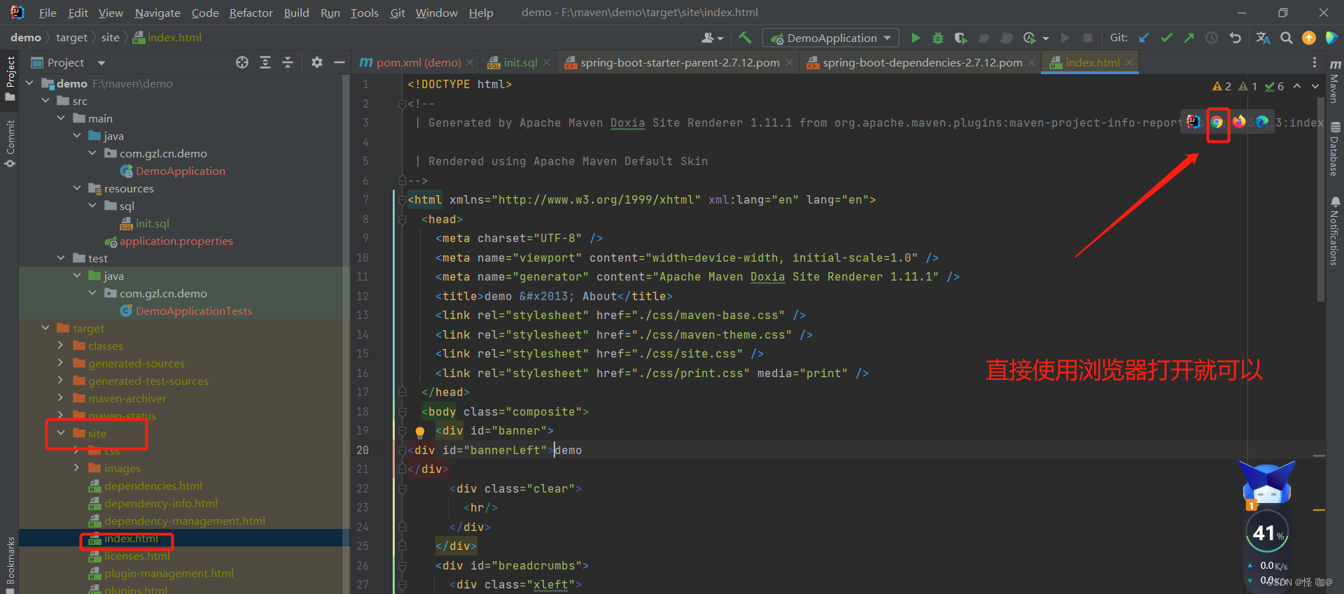 执行成功以后可以在当前项目target目录下会有一个site目录,这就是生成的站点!