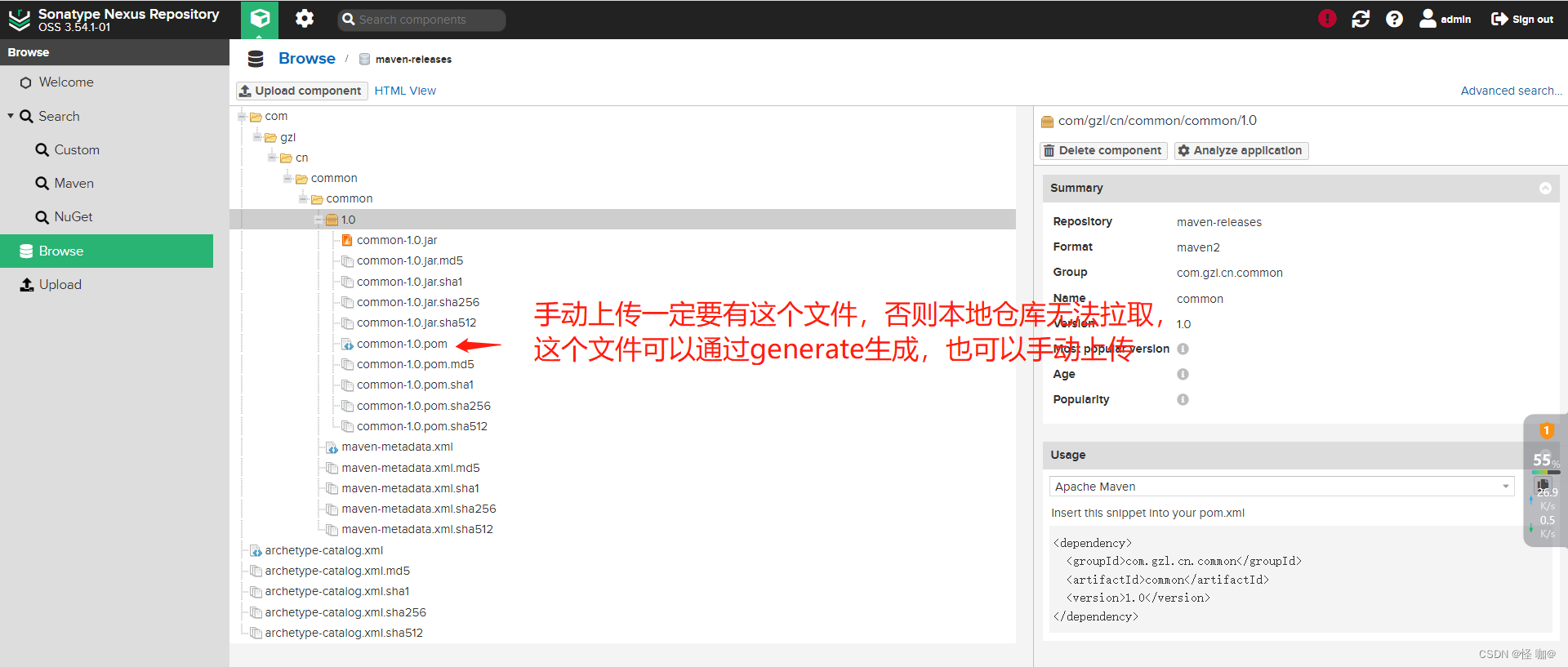 - 其次,jar如果有其他依赖,一定要单独上传pom.xml文件,否则关联依赖无法拉取
