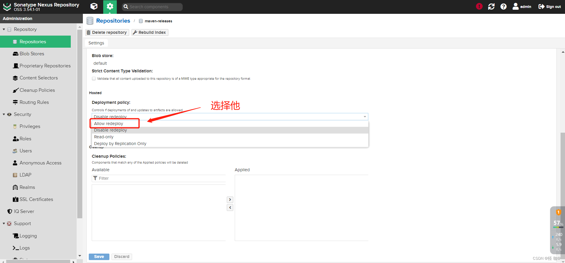 release仓库需要把这块改一下,设置为Allow redeploy代表允许我们对仓库中的依赖维护升级新版本,如果设置为disable redeploy意味着我们无法将升级版本上传上来。