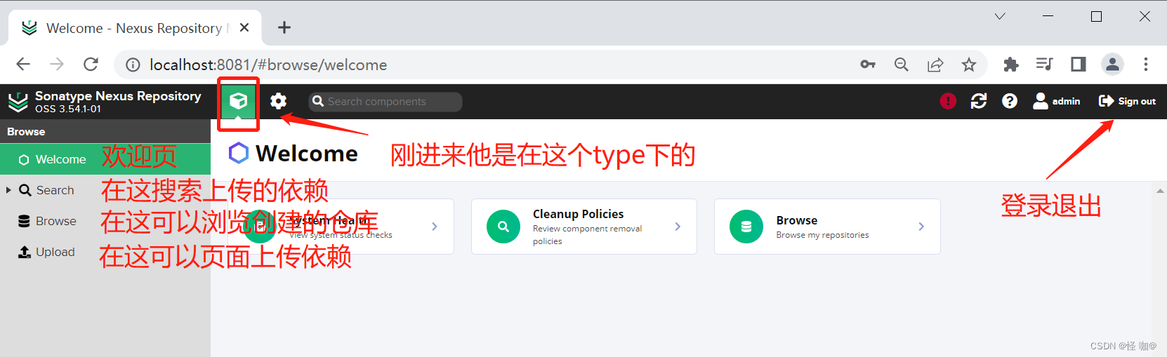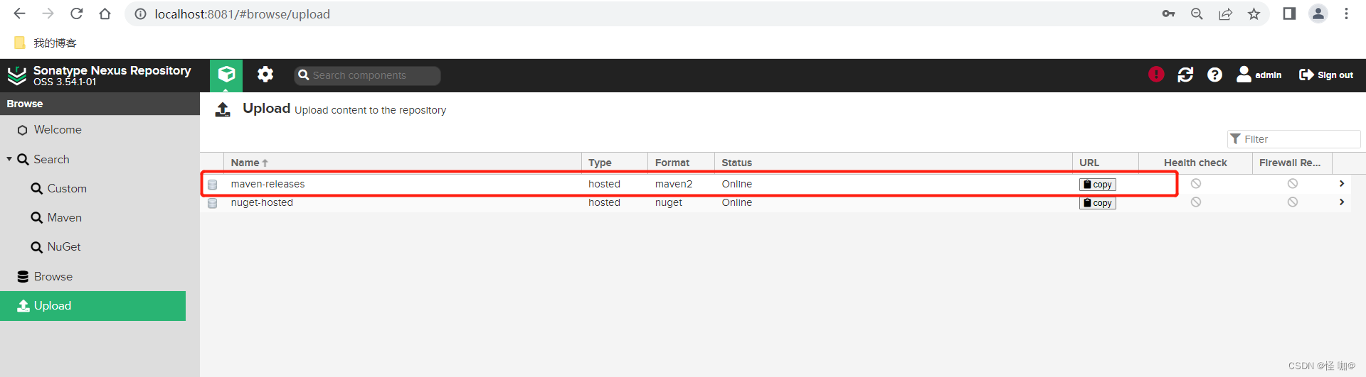 (3)在 Nexus 界面的upoad上传,默认是只允许上传releases仓库。