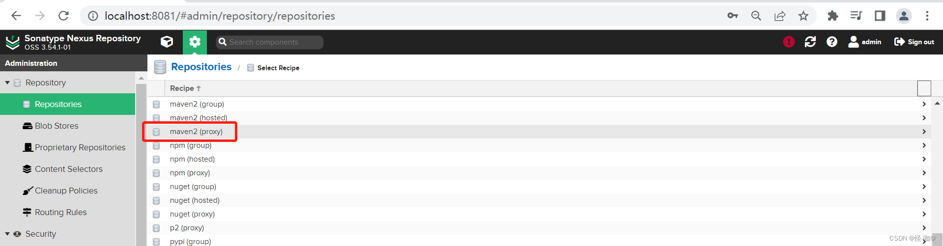 刚安装好的nexus一共给我们创建了7个仓库(不同的nexus版本可能有一点差距),我们只需要关注Format为maven2的仓库即可,也就是一共有4个: