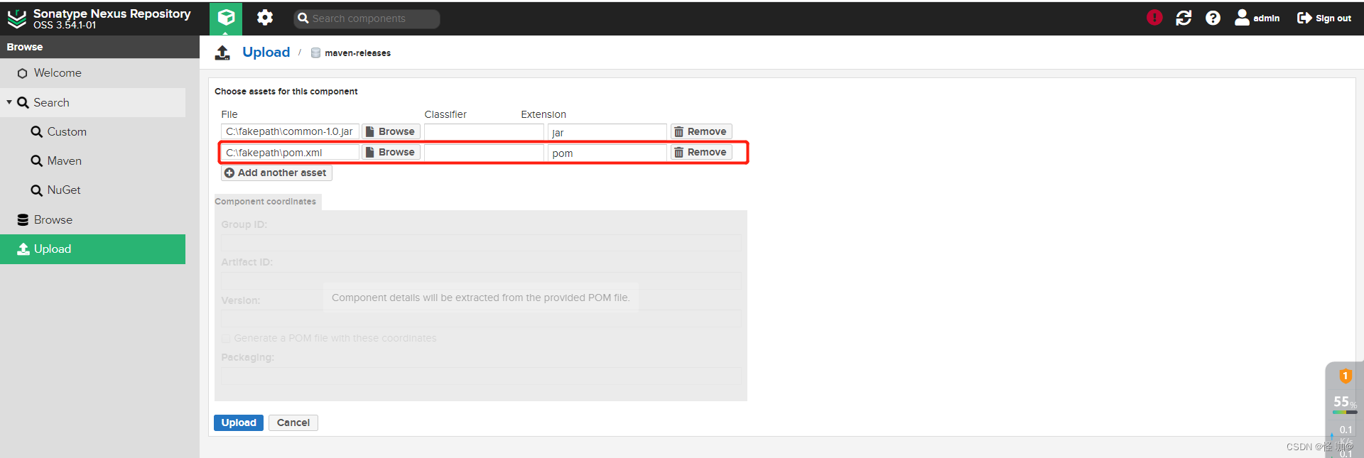 如果该jar包还有其他依赖,那么需要手动上传pom.xml文件,就不能点击上面的generate生成了,通过点击add another asset 增加,操作如下