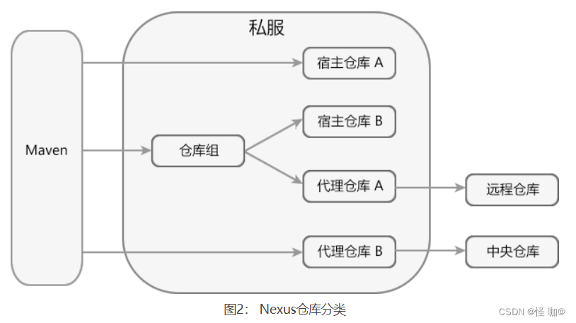 为了更加直观的理解仓库组、代理仓库和宿主仓库的概念,我们通过下图展示它们的用途和区别。