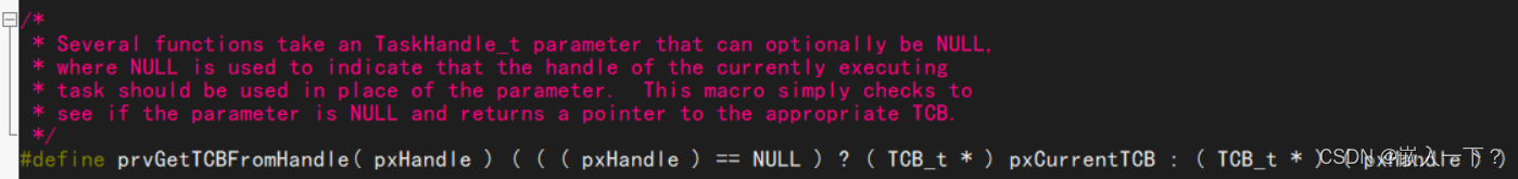 - 在 vTaskDelete 函数中调用了 prvGetTCBFromHandle 宏来判断该传入TCB参数是否为空,若是为空,则获取当前正在执行的任务的 TCB ,否则返回传入的 TCB 指针。