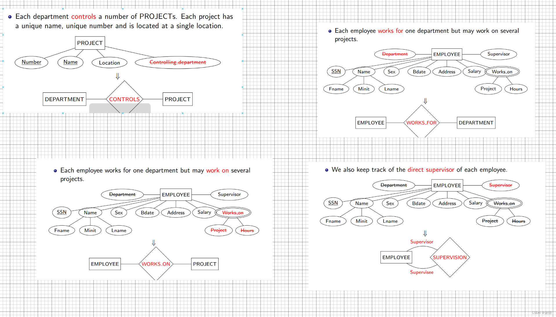 我们存储每个员工的SSN,地址,薪资,性别和出生日期。每个员工都在一个部门工作但是可以参与多个项目。