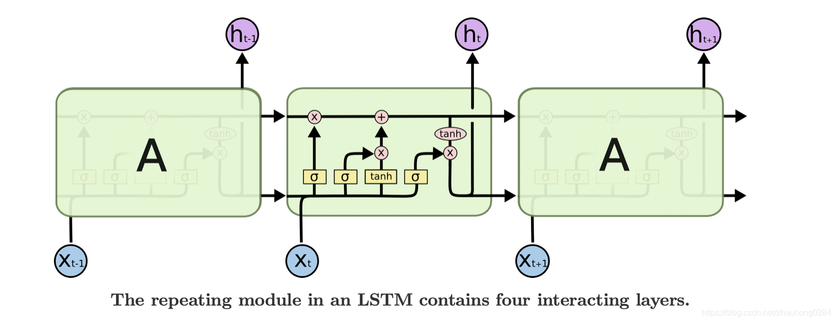 每个黄色方框表示一个神经网络层,由权值,偏置以及激活函数组成;每个粉色圆圈表示元素级别操作;箭头表示向量流向;相交的箭头表示向量的拼接;分叉的箭头表示向量的复制
