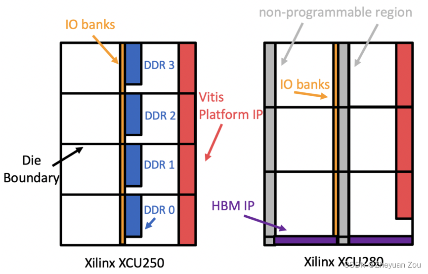 比如对于上图的Xilinx XCU250 FPGA, DDR控制器IP核与Die边界将整个FPGA板分成了